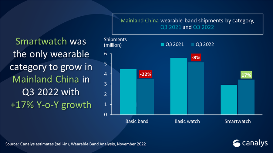 根据 Canalys 的最新估计,2022年第三季度中国手环市场延续疲软表现,整体出货量下降 7.1%,降至1200 万只。但是,智能手表在第三季度逆势增长(16.8%),达到340 万只。上半年,中国各城市经历了间歇性封城,消费者对可穿戴手环等非必需品的消费更加谨慎。这在基础手环市场中得到体现,该市场连续八个季度下滑,出货量降至350万只。 基础手表在本季度也下降了 7.7%,出货量降至510 万只。基本款手表仍然占据最大的市场份额,占中国整体市场的 40% 以上,而基本款手环和智能手表几乎平分秋色,分别为 29% 和 28%。