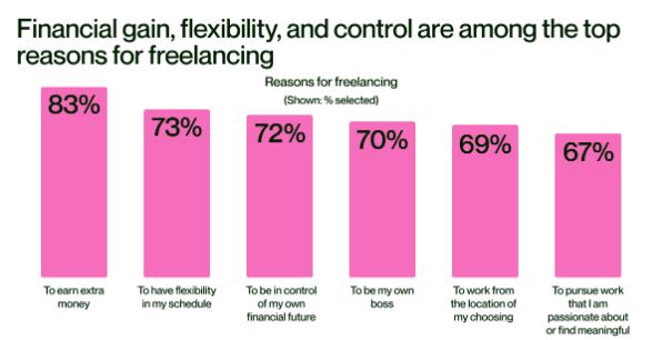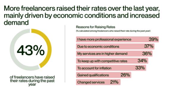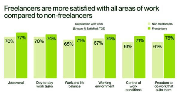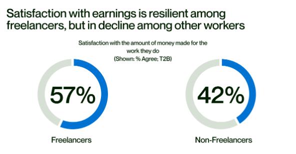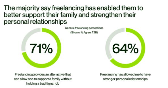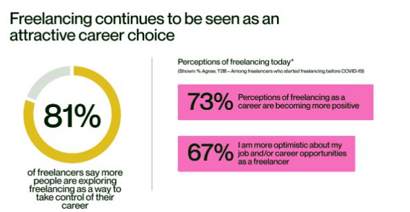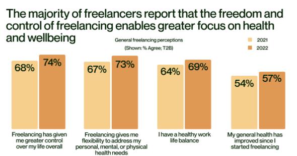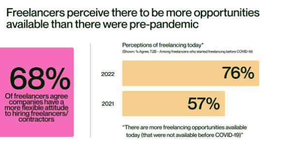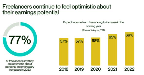 对自由职业的看法继续转变:73%的自由职业者表示,将自由职业作为一种职业的看法正变得更加积极,高于 2021 年的 68%。