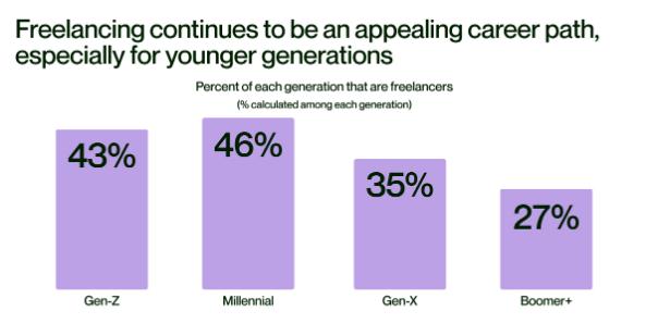 Z 世代和千禧一代最有可能探索自由职业:2022 年,43% 的 Z 世代专业人士和 46% 的千禧一代专业人士从事自由职业。
