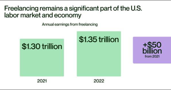 自由职业者仍然是美国劳动力市场和经济的重要组成部分:2022 年自由职业者为美国经济贡献了 1.35 万亿美元,比 2021 年增加了 500 亿美元。