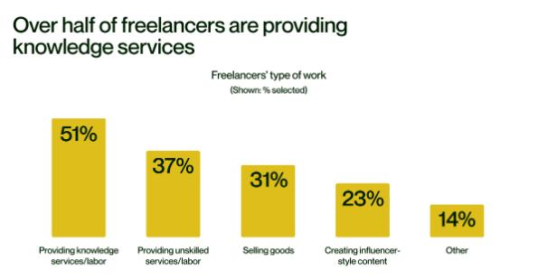 超过半数的自由职业者提供知识服务:2022 年,51% 的自由职业者,即近 3100 万专业人士提供计算机编程、营销、IT 和商业咨询等知识服务。