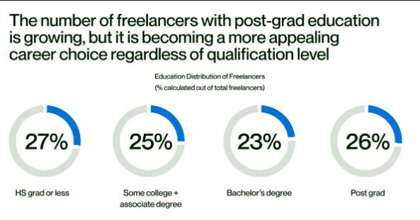 自由职业者在受教育程度最高的人群中继续增长:26% 的美国自由职业者拥有研究生学位,高于 2021 年的 20%。