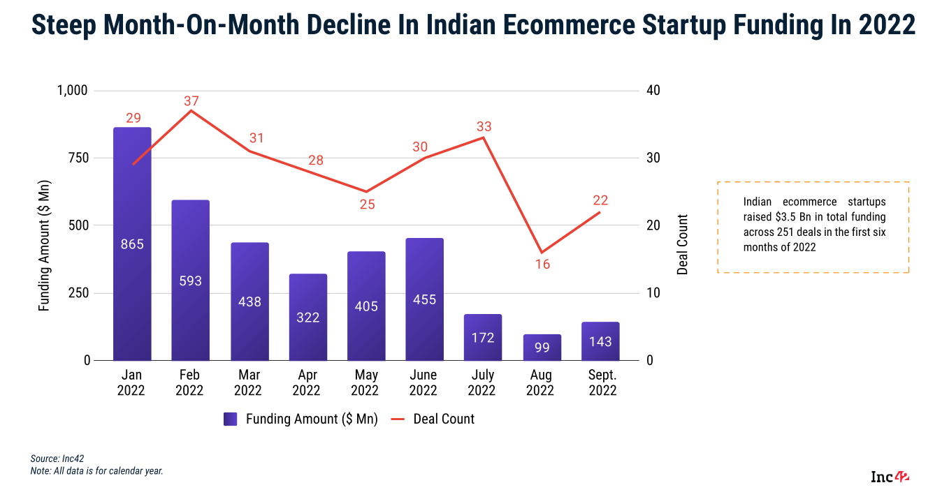 2021年第三季度至2022年第三季度,印度电商市场融资情况经历了一轮陡降,剧烈冲击到当地电商生态系统良性发展,行业迎来了“融资寒冬”。