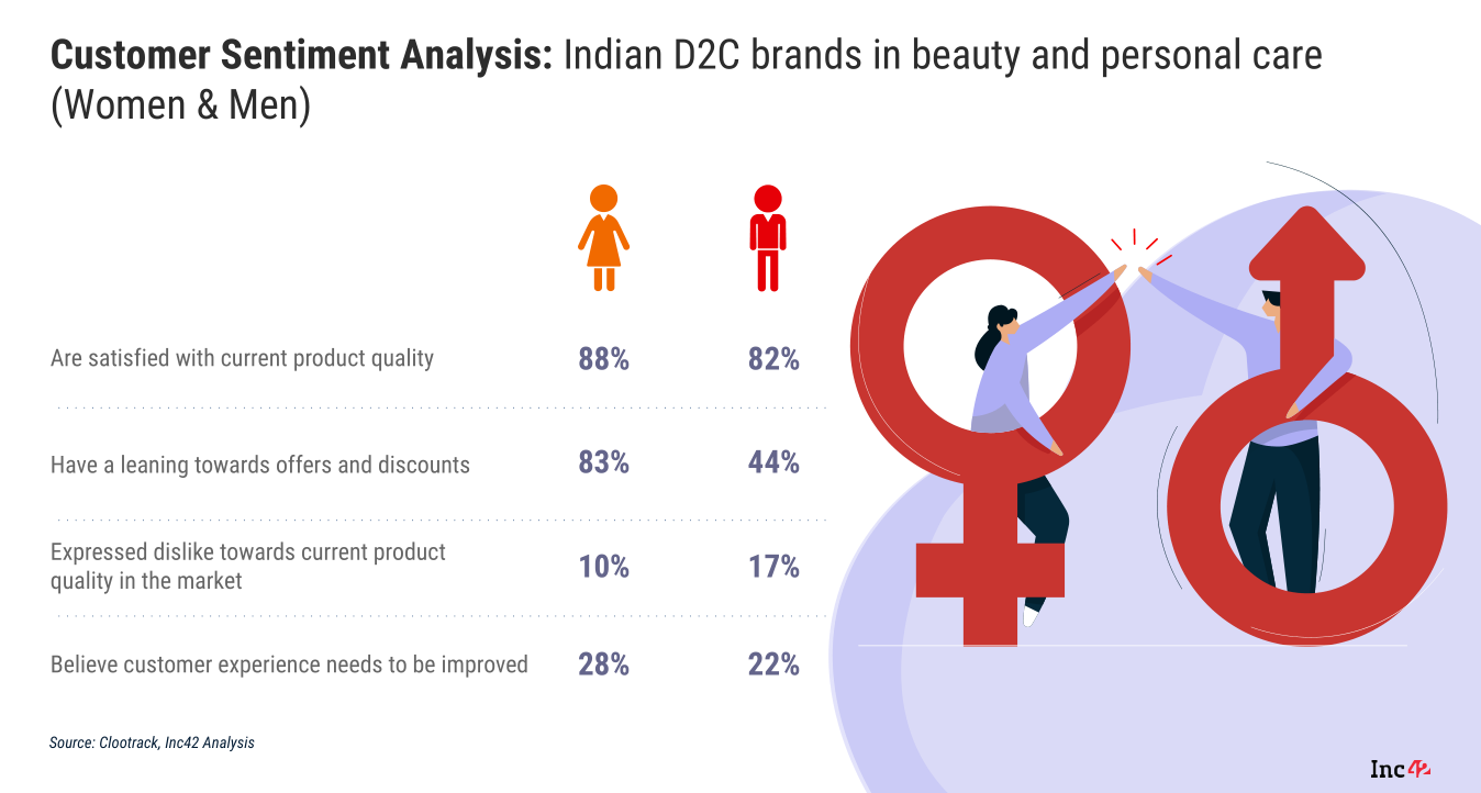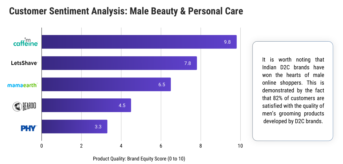 值得注意的是,印度男性消费者意向调研中,印度D2C品牌也赢得了他们的“芳心”。82%的消费者对D2C品牌开发的男士美容产品质量表示满意。
