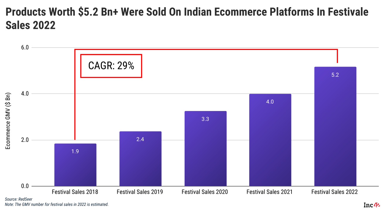 2022年,印度电商市场假期旺季销售额共计高达52亿美元。2018年至2022年以来,该市场中的假期线上销售GMV逐年递增,年复合增长率达到29%。
