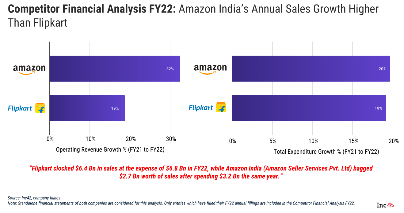 印度电商市场竞争中,亚马逊印度站点2022财年的年度销售额增长率超过Flipkart。
