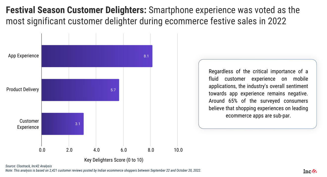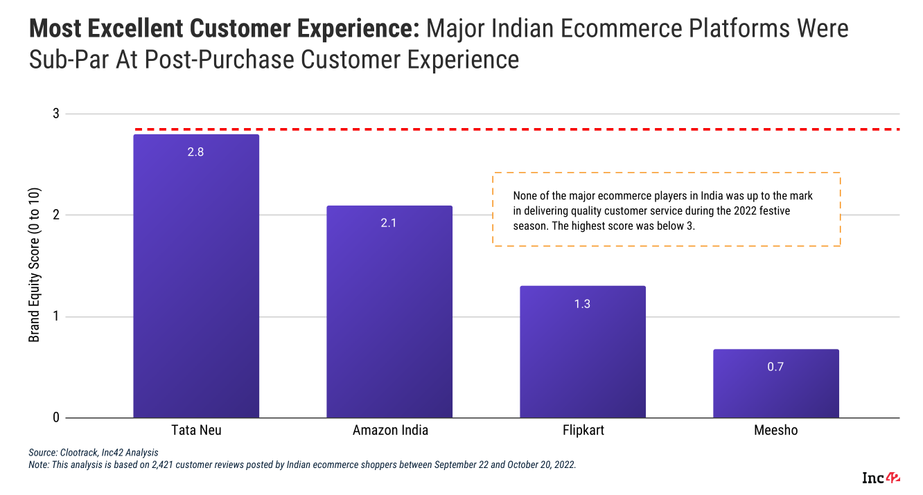 同在假期销售期间,印度电商市场中也没有一家主流电子商务公司能够提供高质量的客户服务,Tata Neu哪怕获得最高分,也仅仅在3分线以下(总分10分)。
