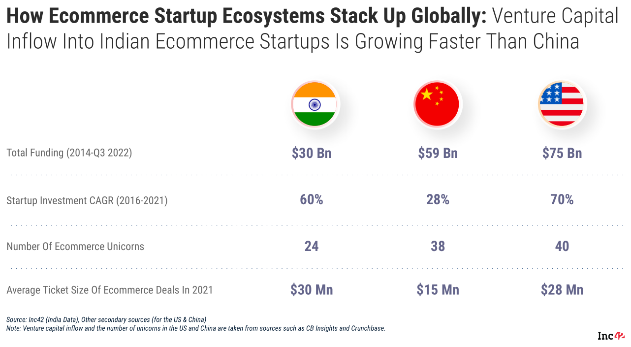 与此同时,风险投资越发青睐印度的电商创业市场,资本流入速度超过中国。2014年至2022年第三季度,印度电商市场共计获得300亿美元投资。2016年至2021年的创业投资年复合增长率达到60%。