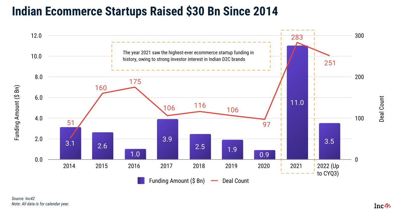 2021年也是印度电商市场“吸金”最为疯狂的一年,资本市场非常看好其D2C市场的发展潜力,当年共计注入110亿美元风险投资。