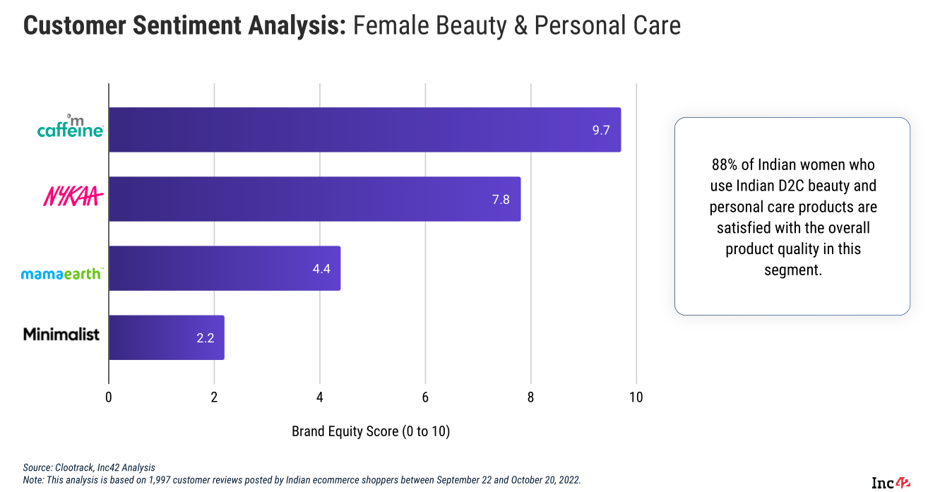 印度女性消费者意向调研中,88%的消费者对于印度D2C美妆个护品牌的整体产品质量表示满意。