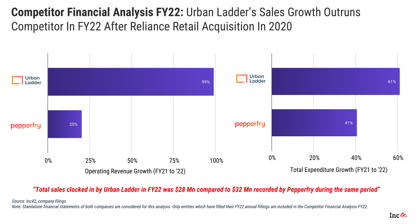 2022财年中,Urban Ladder的年度销售额为2800万美元;Pepperfry的年度销售额则为3200万美元。