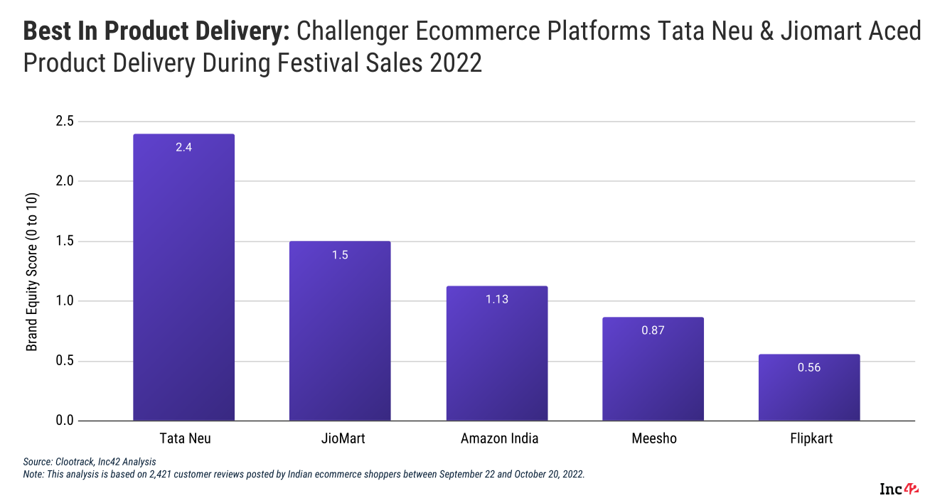 在假期销售期间,Tata Neu与Jiomart的物流评分表现超过亚马逊印度站、Meesho与Flipkart。