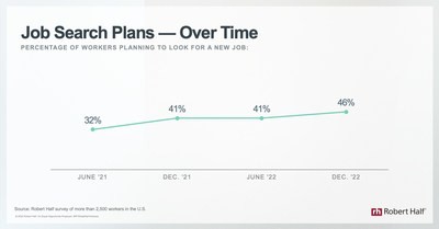 人才解决方案和商业咨询公司 Robert Half 的研究表明,尽管经济存在不确定性,但许多工人在新的一年里仍将着眼于更美好的未来。该公司对2500 多名美国专业人士进行的半年一次的工作乐观调查显示,46%的受访者目前正在寻找或计划在2023年上半年寻找新职位,高于六个月前的41%。