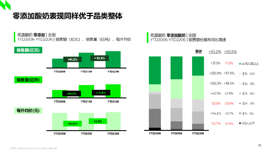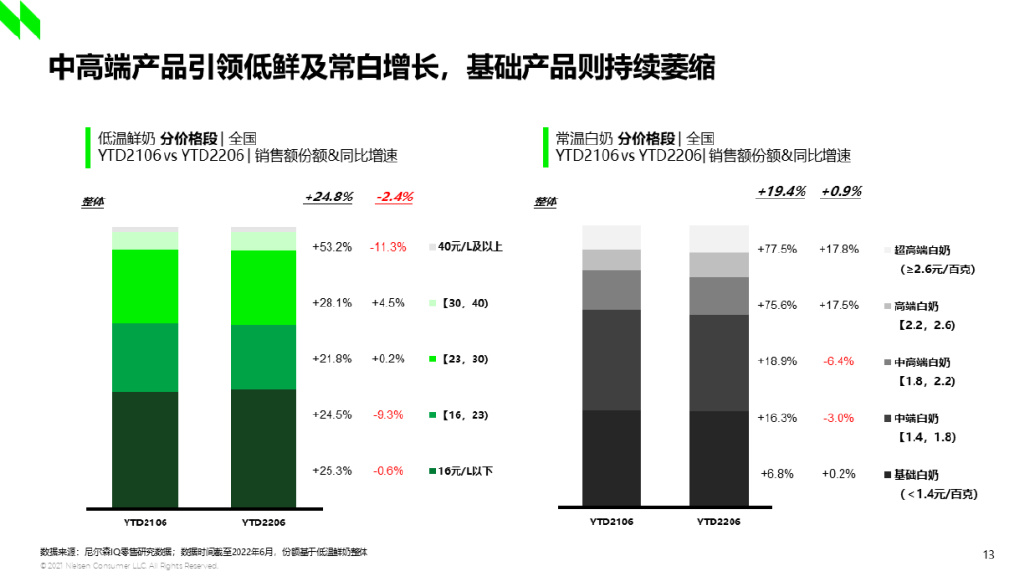 其次能保持增长的细分是更健康的产品。低温酸奶整体去年和今年上半年销售额的增速都为负的10%,但仍有部分细分品类增速喜人:控糖酸奶今年上半年的销售额增速接近50%,且价量齐升,高价位段的增速高于低价位段。0添加酸奶的表现虽不及控糖酸奶,但在整体大环境下跌的趋势下仍保持了双位数的增长。可见消费者对品质更好、成分更健康的中高端产品的需求增加,乳制品产品有向更高端、更健康的方向发展的趋势。