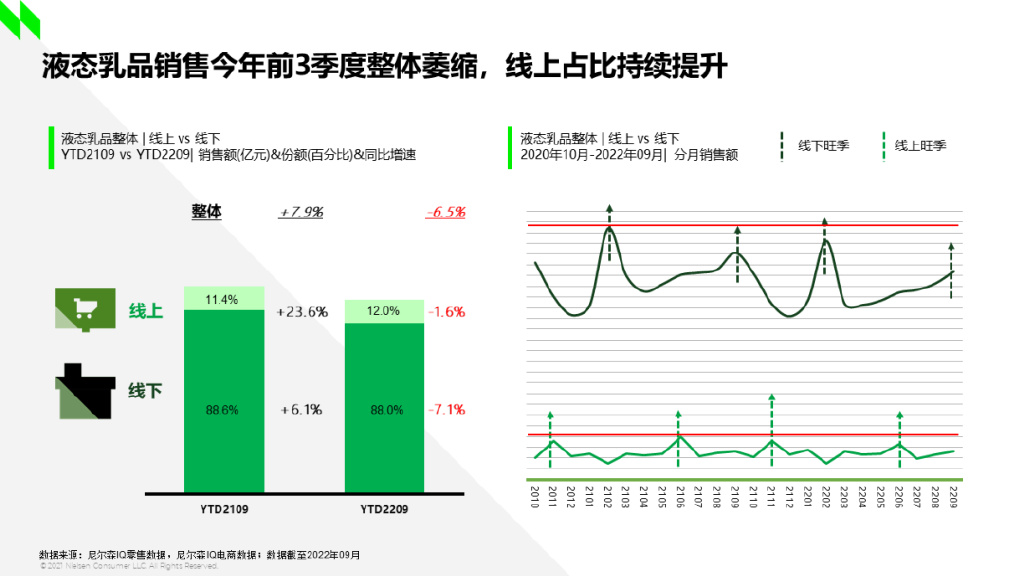 纵观消费品市场,去年前三季度,除粮油主食外,饮料、零食、酒类等快消品主要品类的增速都为正,而今年刚好相反,除了粮油主食的增速为正,其余品类为负,可见生活必需品在疫情下仍是“硬通货”。纵观乳品市场,去年,乳品以7.9%的增速排名第二,仅次于饮料的11.7%,可见疫情使消费者对健康和免疫力的关注增强,也为乳品行业的增长注入了动力。虽然今年前三季度整个乳品呈现负增长,但不同细分市场中也有增速为正,甚至是双位数增长的品类。线上市场的销售重要性占比越来越高。线上线下的销售旺季仍然显著,但旺季的销售峰值从去年下半年开始呈下降态势。