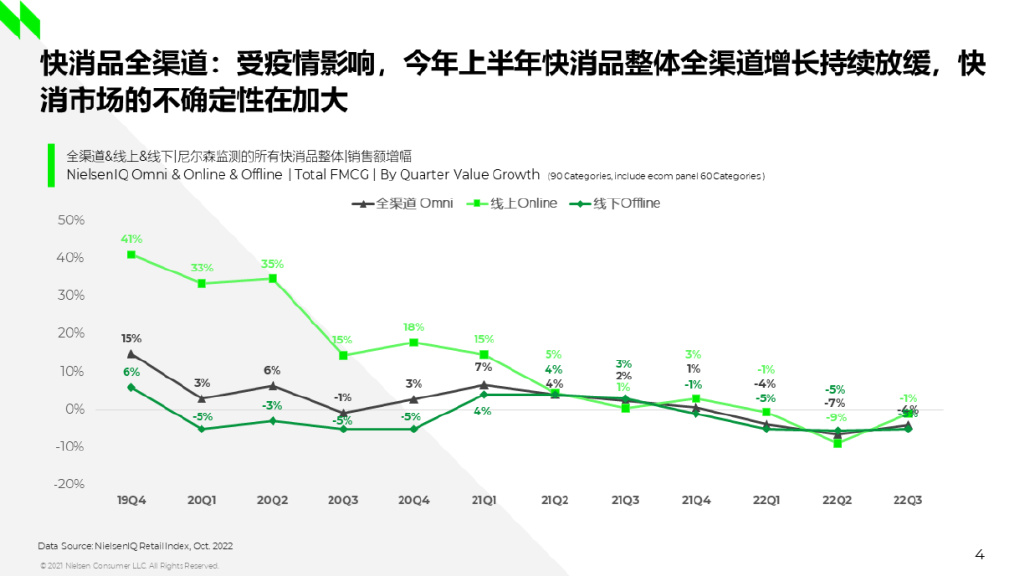 受疫情影响,今年社会消费品零售总额的同比增速在二季度大幅度下滑,下半年开始回升,8月增速达到今年以来的最高5.4%,9月又开始向下波动,消费市场的不确定性依存。根据尼尔森IQ的监测数据显示,受疫情影响,整个快消市场全渠道的增速在波动中持续放缓。2020年疫情年,线上渠道的高速增长拉动了整个快消行业全年增速为正。2021年线上渠道的增速开始放缓,线下渠道逐步恢复,而今年线上和线下渠道增速进一步趋同。