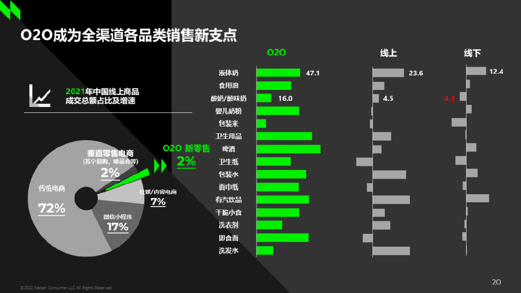 目前O2O在线上渠道的销售额占比仅占2%,但增速高达50%。根据尼尔森IQ监测到的主要快消品类线上、线下、O2O的销售数据显示,大部分品类O2O增速都大于线上和线下渠道。对液奶来说,去年O2O增速接近50%,远高于线上线下渠道增速,而酸奶的O2O增速也达到了16%。对乳制品品牌商来说,如何抓住O2O带来的增长机会?企业需抓住产品策略、平台选择策略、营销策略、供应链策略等风口。