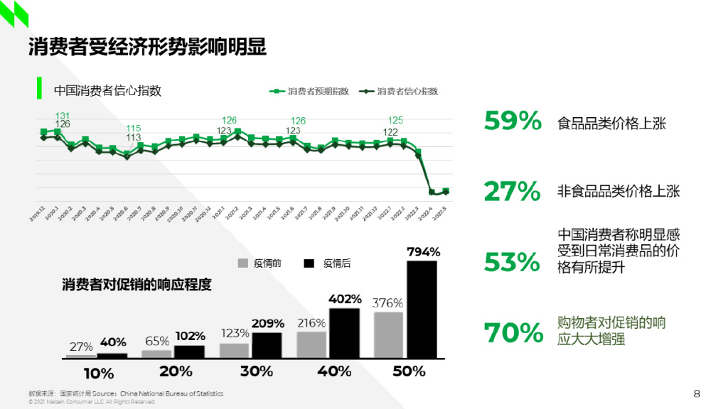 从消费者层面来看,他们在新常态下变得更加理智,也更注重所购买产品的组成成分。面对经济形势的不确定性和压力,消费者信心指数在2020年疫情过后基本保持稳定,但从今年3月开始呈现断崖式下跌。与前两年相比,疫情带给消费者的影响除了健康和卫生之外,又新增了价格和促销这两个关注点。在尼尔森IQ监测的80多个品类当中,超过一半的食品品类和超过1/4的非食品品类的均价都呈现上涨态势。53%的消费者在调研中表示,他们明显感受到了日常物价的上涨,且面对相同的折扣力度,消费者在后疫情时代的响应程度要远高于疫情前。