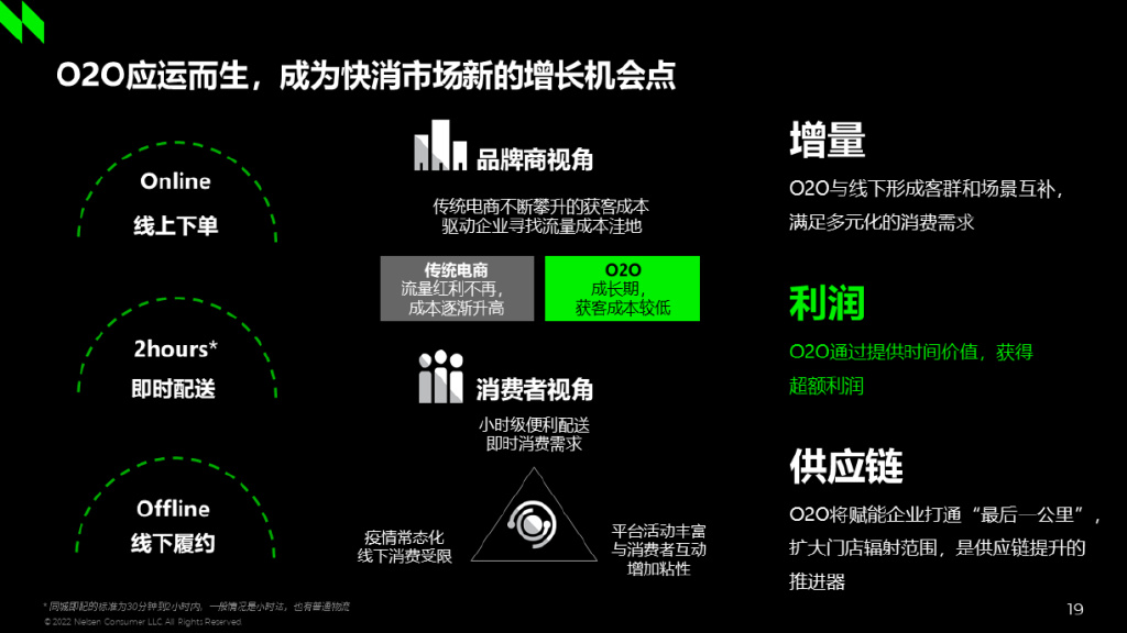 从品牌商的角度来看,在传统电商流量红利逐渐消失,获客成本不断攀升的背景之下,O2O为品牌商们提供了获客成本相对较低、且能够获得溢价的增长机会。而对消费者来说,O2O这种小时级的消费方式真正满足了对即时性和便利性更高层次的消费需求。O2O的即时性为消费者提供了宝贵的时间价值,因此也可不同程度地产生溢价。根据尼尔森IQ对多个品类的O2O和线下现代渠道的销售排名前20的单品当中的重叠单品的价格比对发现,O2O存在明显溢价。