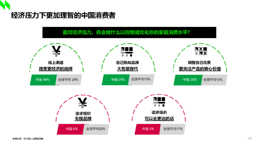 根据尼尔森IQ针对全球消费者的调研显示,中国消费者和其他国家的消费者在经济压力下应对调整消费水平的策略有很大不同:中国消费者倾向于利用线上渠道去寻找更经济实惠的选择,更多地选择自己熟悉品牌的大包装产品,同时更关注产品的核心价值,对非核心功能的要求有所缩减。这说明消费变得更加理智。