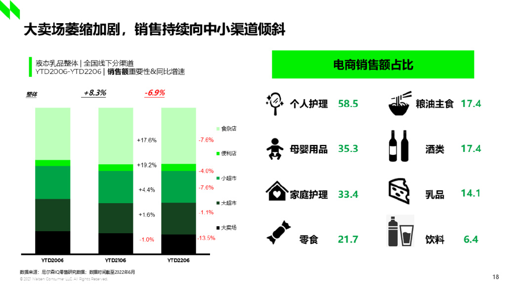 液态乳品的市场趋势和快消渠道整体类似,去年上半年除大卖场以外,其余线下渠道都呈增长态势,且便利店和食杂店等近场小业态的增速更快。今年上半年线下渠道都不同程度地受到大环境影响,但中小型渠道所占的销售额份额保持提升。