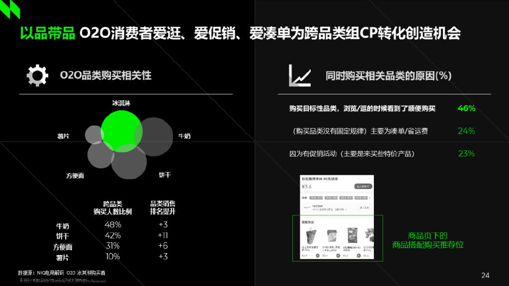 消费者在O2O上购物时,更容易受到促销和凑单等因素的影响,因此适时推荐相关产品,比如对买谷物的消费者推荐鲜奶,对买水果的消费者推荐酸奶,可以提高产品的销售转化率。通过品类间天然的关联性和有效的运营策略配合,可以更高效地带动产品的销量。