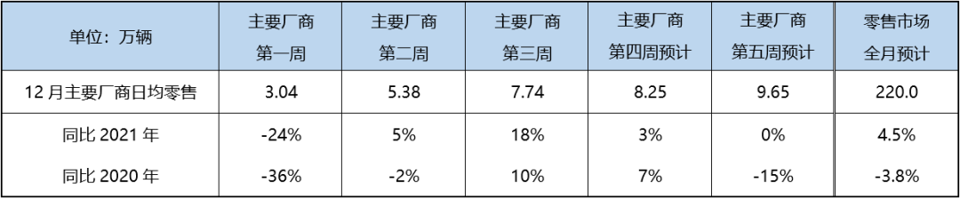 12月以来,疫情防控措施发生巨大调整,各地放松管控,前期车市压抑刚需快速回补,主要厂商零售第一、二、三周的日均同比分别为-24%、5%、18%。临近年末,燃油车购置税优惠和新能源补贴政策即将到期,终端维持快速交车节奏,预计第四周市场延续第三周增长走势。考虑到各地感染高峰的到来,消费者行为比较谨慎,聚集性活动和出行减少,年底翘尾效应可能受到抑制,第五周预计日均零售同比与去年持平。综合估算12月零售将达到220.0万辆。