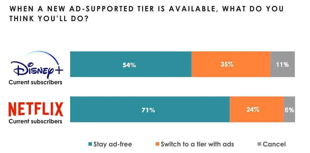 SVOD 两大巨头最近推出他们的 AVOD 游戏,35% 的Disney+ 用户和 24% Netflix 用户预计在新的广告支持选项可用时,他们将改变订阅类型。这样的优惠也引起了目前尚未订阅的观众的兴趣。22% 的 Disney+ 非订阅者认为,一旦新的广告支持类型可用,他们就会注册 Disney+。同样有 22% 的 Netflix 非订阅者预计会注册 Netflix 服务,其中 15% 的人预计会注册广告支持的类型。
