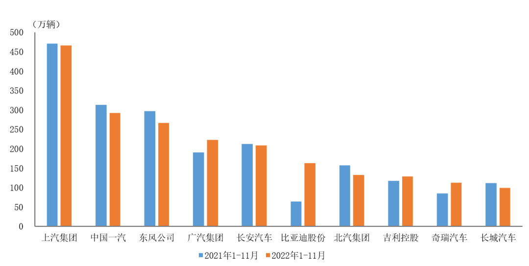 中国汽车工业协会: 2022年1-11月前十家汽车生产企业销售情况简析 据中国汽车工业协会统计分析,2022年1-11月,汽车销量排名前十位的企业(集团)共销售2094.5万辆,占汽车销售总量的86.2%。 在上述十家企业中,与上年同期相比,比亚迪股份销量增速最为明显,奇瑞汽车、广汽集团和吉利控股也呈两位数快速增长,其他企业呈不同程度下降。 更多阅读:中国汽车工业协会:2022年1-8月前十家汽车生产企业销售情况简析中国汽车工业协会:2023年1-5月前十位汽车生产企业销售情况简析中国汽车工业协会:2022年1-6月前十家汽车生产企业销售情况简析中国汽车工业协会:2022年1-5月前十家汽车生产企业销售情况简析中国汽车工业协会:2022年3月前十位轿车品牌销量排名中国汽车工业协会:2023年1-2月我国汽车商品出口金额前十国情况简析中国汽车工业协会:2021年5月汽车工业运行情况简述中国汽车工业协会:2024年1-6月前十位MPV生产企业销售情况简析中国汽车工业协会:2024年5月海关进出口情况简析中国汽车工业协会:2023年1-8月前十位轿车生产企业销售情况简析中国汽车工业协会:2023年1-7月七大类汽车商品进出口金额情况中国汽车工业协会:2023年1-7月汽车制造业营业收入保持增长中国汽车工业协会:2023年1-7月前十位汽车生产企业销售情况简析中国汽车工业协会:2023年6月中国汽车整车出口情况简析中国汽车工业协会:2023年5月我国汽车整车出口情况简析