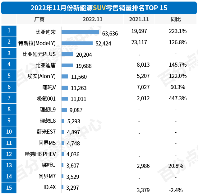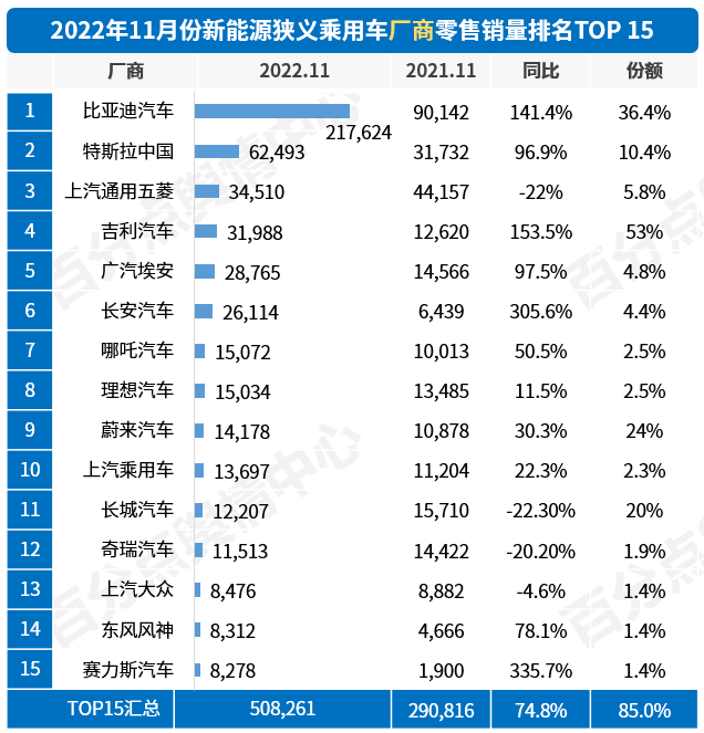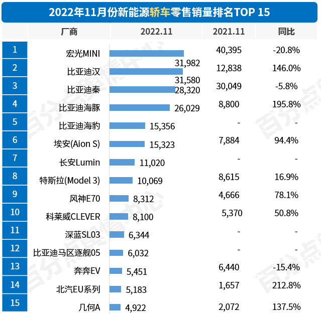 11月的新能源车环比走势受到个别地区防疫措施的影响,闭店情况较突出。各地防疫管控力度大,店头集客方式有一定程度影响,但部分新能源厂商订单积累较好,加之灵活的价格宣传,头部厂商增量明显。