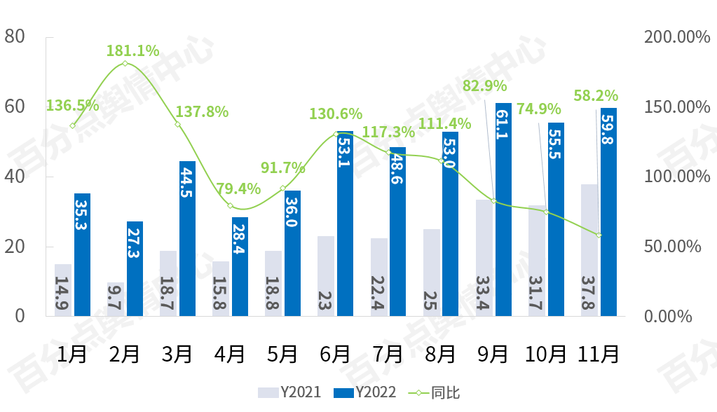 11月新能源乘用车零售销量达到59.8万辆,同比增长58.2%,环比增7.8%,1-11月保持趋势性上升走势。