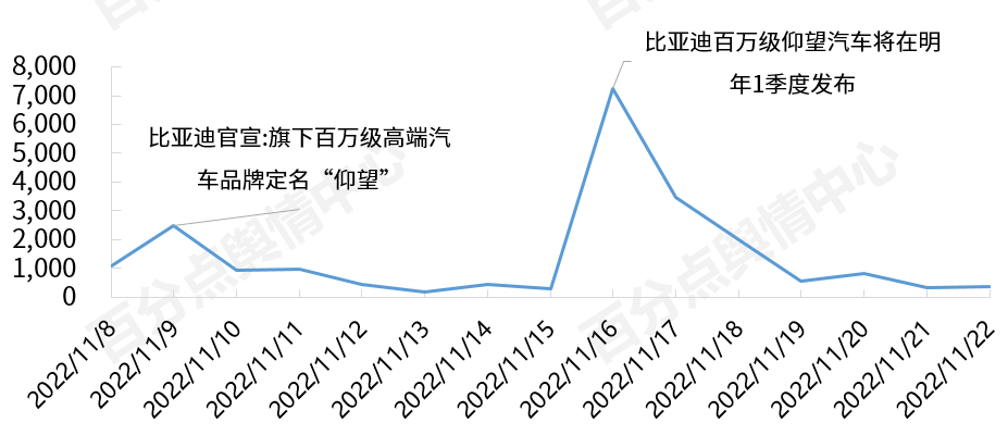 11月9日,比亚迪汽车宣布,将推出百万级高端品牌“仰望”,号称“仰望不仅是一种姿态,更是一种勇敢无畏的探索精神。仰望以颠覆性技术与产品,致力于为用户带来极致性能新体验”。11月16日,比亚迪召开了第300万辆新能源汽车下线发布会,王传福表示,仰望将会在明年第一季度召开发布会,首款新车会在此次发布会上亮相。