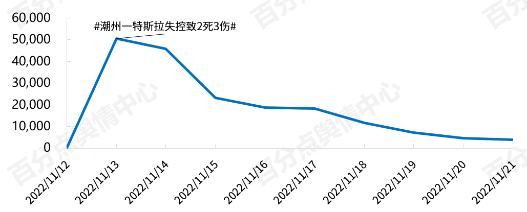 11月13日,广东潮州特斯拉连撞数人事件在网上发酵,相继有多段事故现场视频被曝出。据悉,事故车辆为一辆特斯拉Model Y,车主自称在驾驶该车辆停车时,车辆突然失控高速狂奔,接连撞车,导致2死3伤的严重后果。目前,警方已经介入调查,事故结论尚未公布。11月12日-21日,百分点舆情洞察系统监测到相关信息184,773条,主要传播阵地为网媒平台。