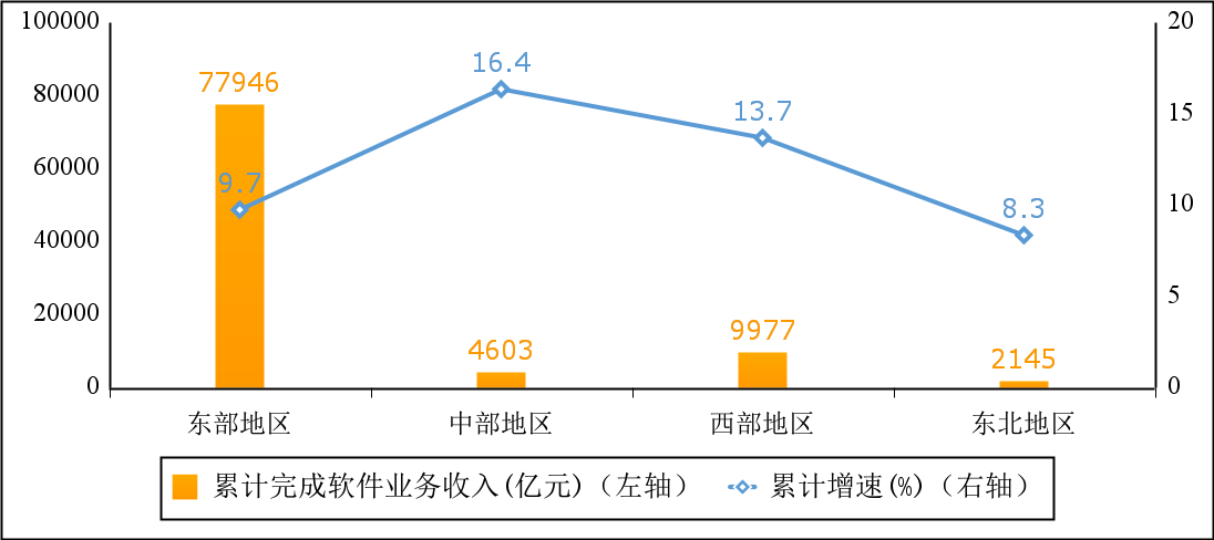 东部地区软件业务收入加快增长,中部地区增势领先。1—11 月份,东部地区完成软件业务收入 77946 亿元,同比增长 9.7%,增速较 1—10 月提高 0.3 个百分点;中部地区完成软件业务收入 4603 亿元,同比增长 16.4%,高出全行业整体水平 6 个百分点;西部地区完成软件业务收入 9977 亿元,同比增长 13.7%,高出全行业整体水平 3.3 个百分点;东北地区完成软件业务收入 2145 亿元,同比增长 8.3%,增速较 1—10 月回落 0.2 个百分点。四个地区软件业务收入在全国总收入中的占比分别为 82.3%、4.9%、10.5% 和 2.3%。