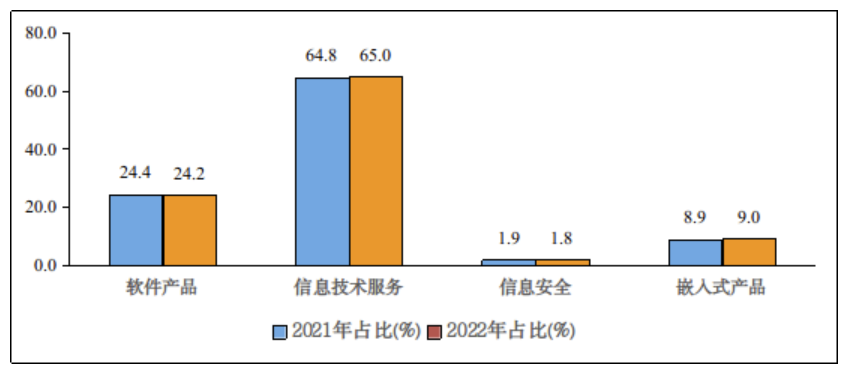 图 4 2021 年和 2022 年 1—11 月份软件业分类收入占比情况