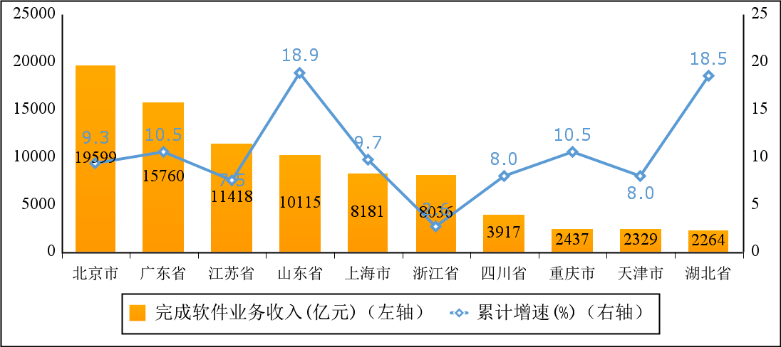 主要软件大省收入占比小幅提升。1—11 月份,软件业务收入居前 5 名的省份中,北京市、广东省、江苏省、山东省、上海市软件收入分别为 19599 亿元、15760 亿元、11418 亿元、10115 亿元和 8181 亿元,分别增长 9.3%、10.5%、7.5%、18.9% 和 9.7%,五省(市)合计软件业务收入 65074 亿元,占全国比重为 68.7%,占比较去年同期提高 0.1 个百分点。