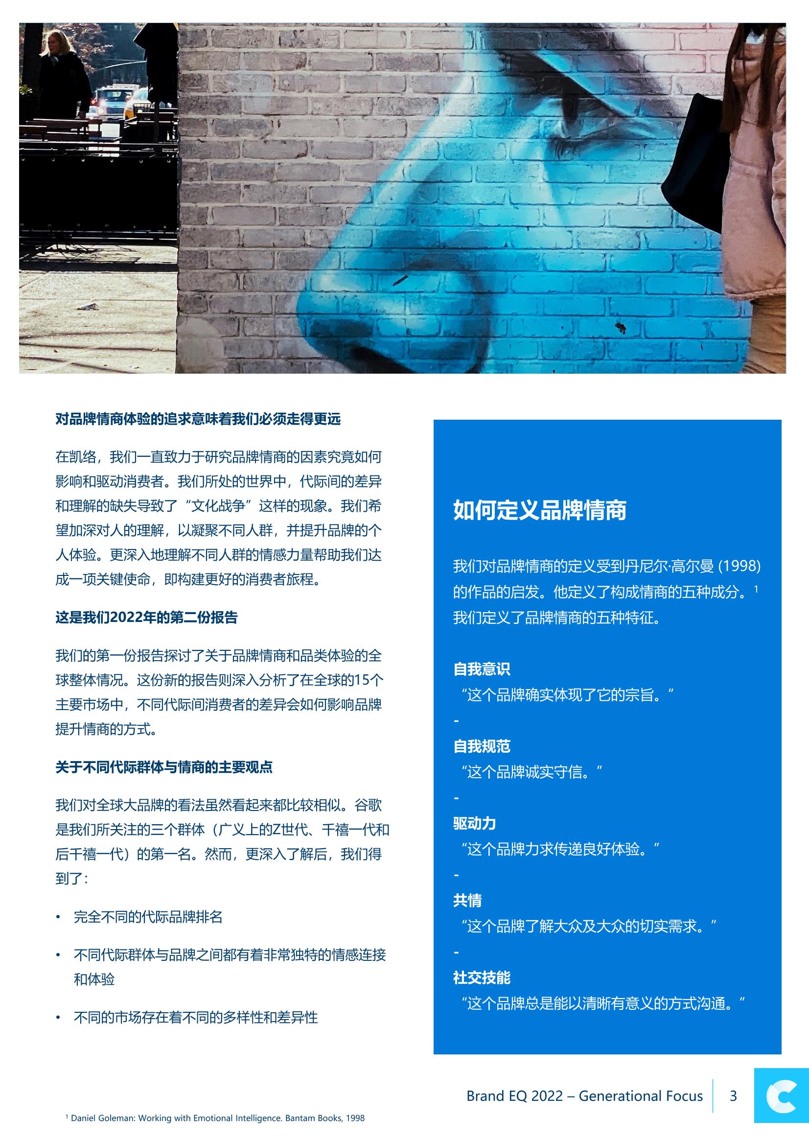 凯络品牌情商是由五个不同的品牌属性组成的综合指标,分别包括了:自我意识、自我规范、驱动力、共情和社交技能。这份报告深入分析了这五大关键属性在不同代际间受访者中的影响,以帮助品牌更好地理解不同人群的情感诉求,打造更紧密的消费者旅程。