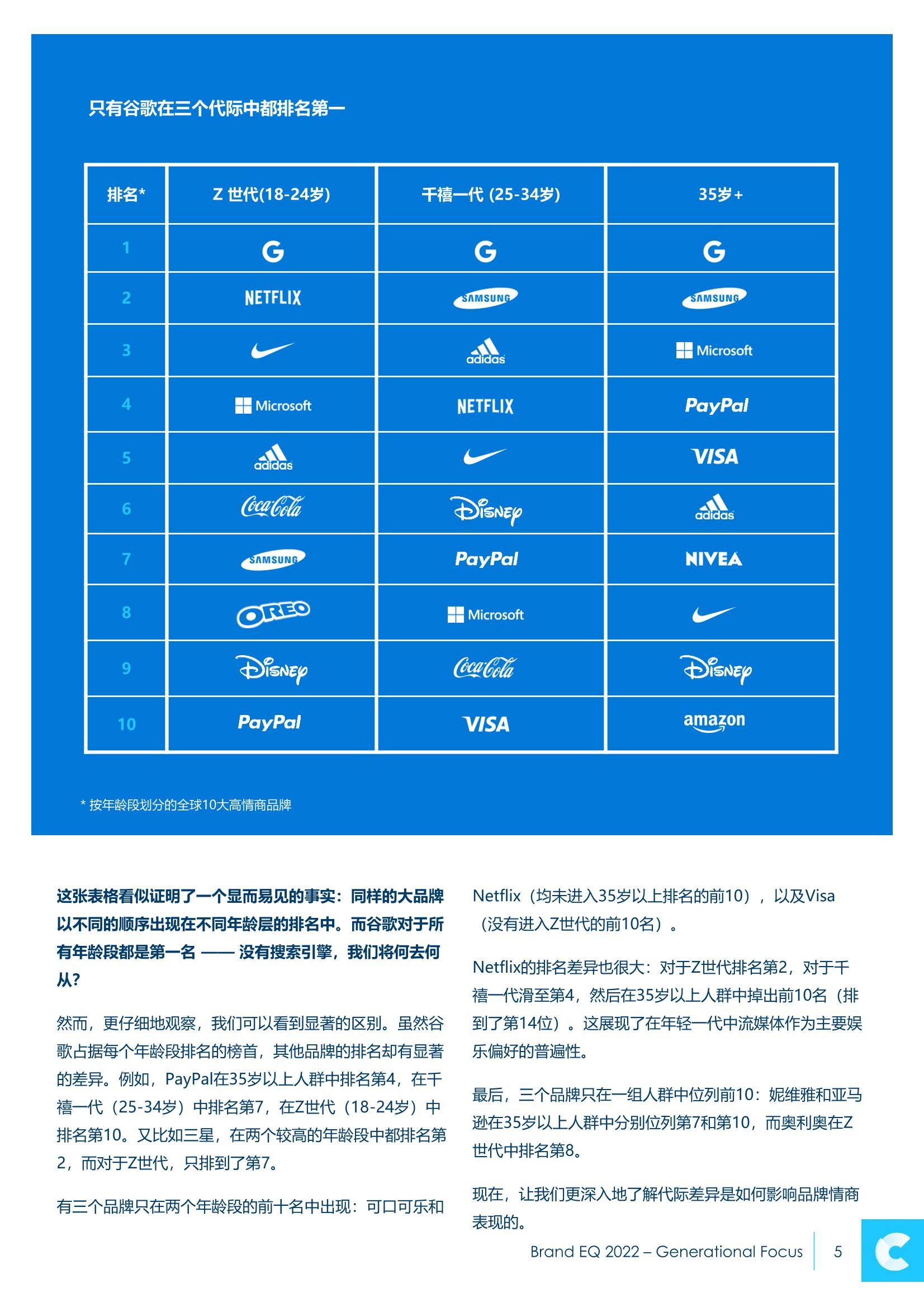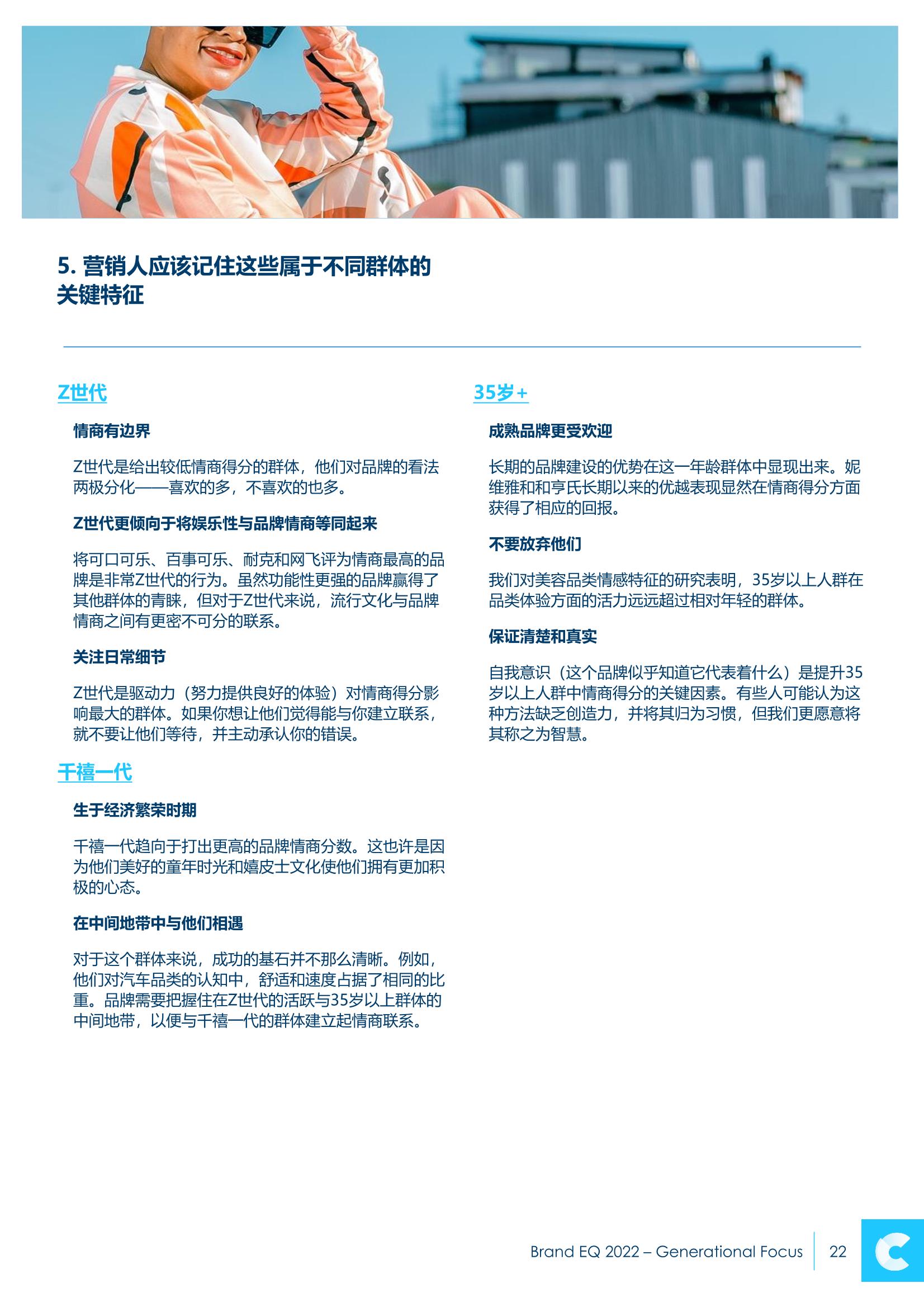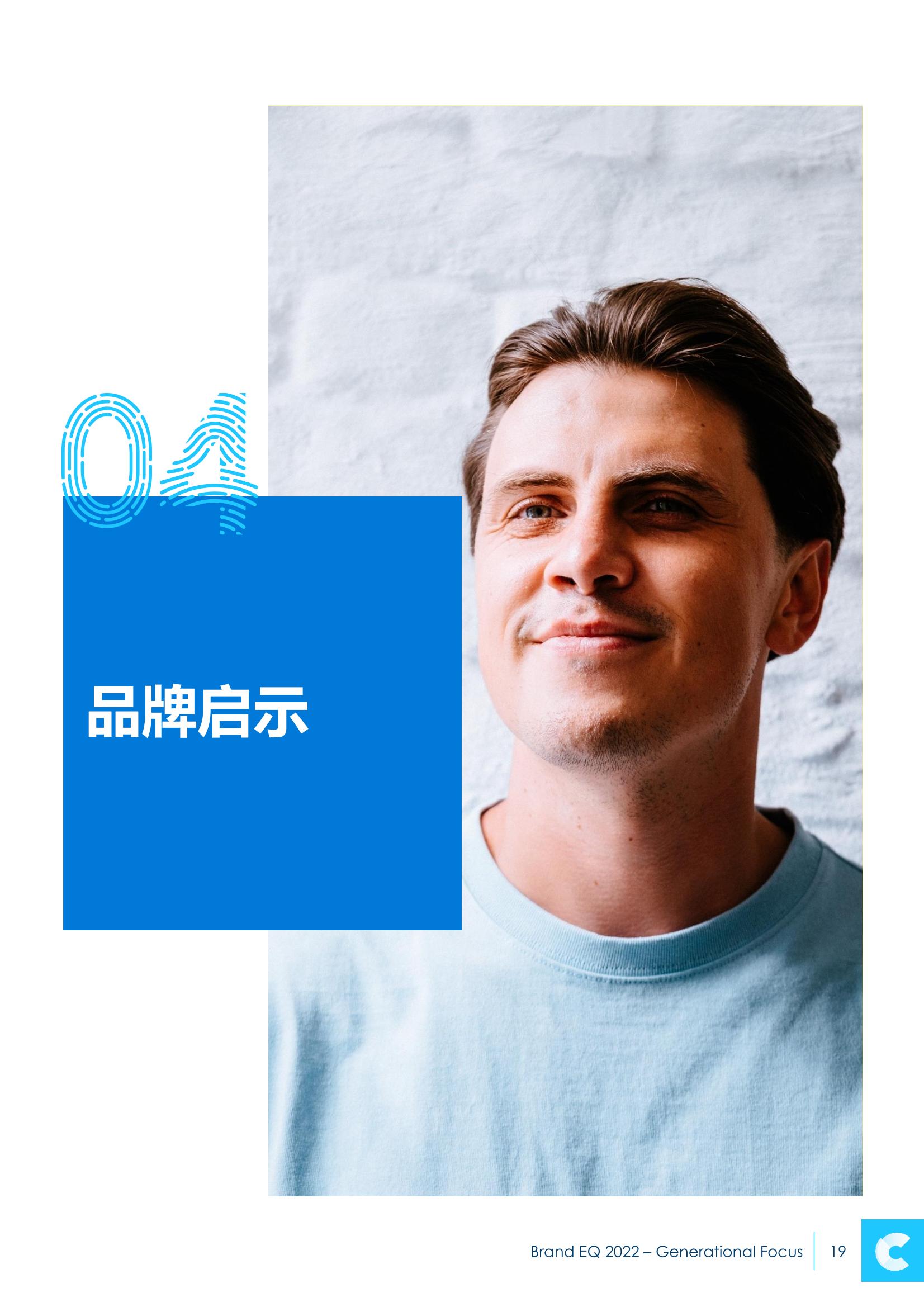 千禧一代趋向于为品牌打出更高的情商分数,这也许是因为他们美好的童年时光和嬉皮士文化使他们拥有更加积极的心态——这意味着品牌应该要把握住在 Z 世代与 35 岁之间的中间地带,与千禧一代的群体建立更紧密的情感联系。