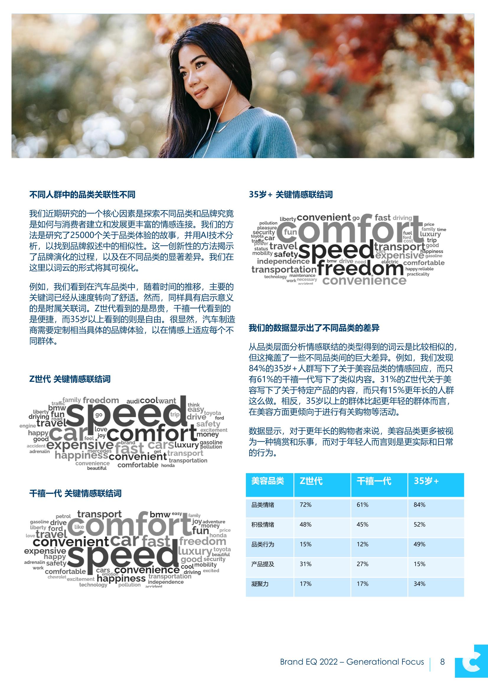 长期品牌建设的优势会在这一年龄群体中显现出来。报告对美容品类情感特征的研究表明,35 岁以上人群在品类体验方面的兴趣远超相对年轻的群体。而自我意识则是提升这一人群中品牌情商得分的关键因素。