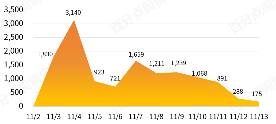 11月3日-13日,“喜茶开放加盟”事件相关舆情声量共计13,145篇,覆盖1,461家媒体。11月3日,喜茶确认开放加盟业务,舆情于11月4日达到顶峰,随后回落。后续随着各平台发布相关深度分析文章,舆情有小幅回升,但整体趋向走弱。