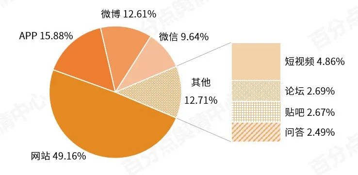 从分布渠道来看,舆情声量主要集中在网站、APP、微博、微信平台,总占比超过85%。