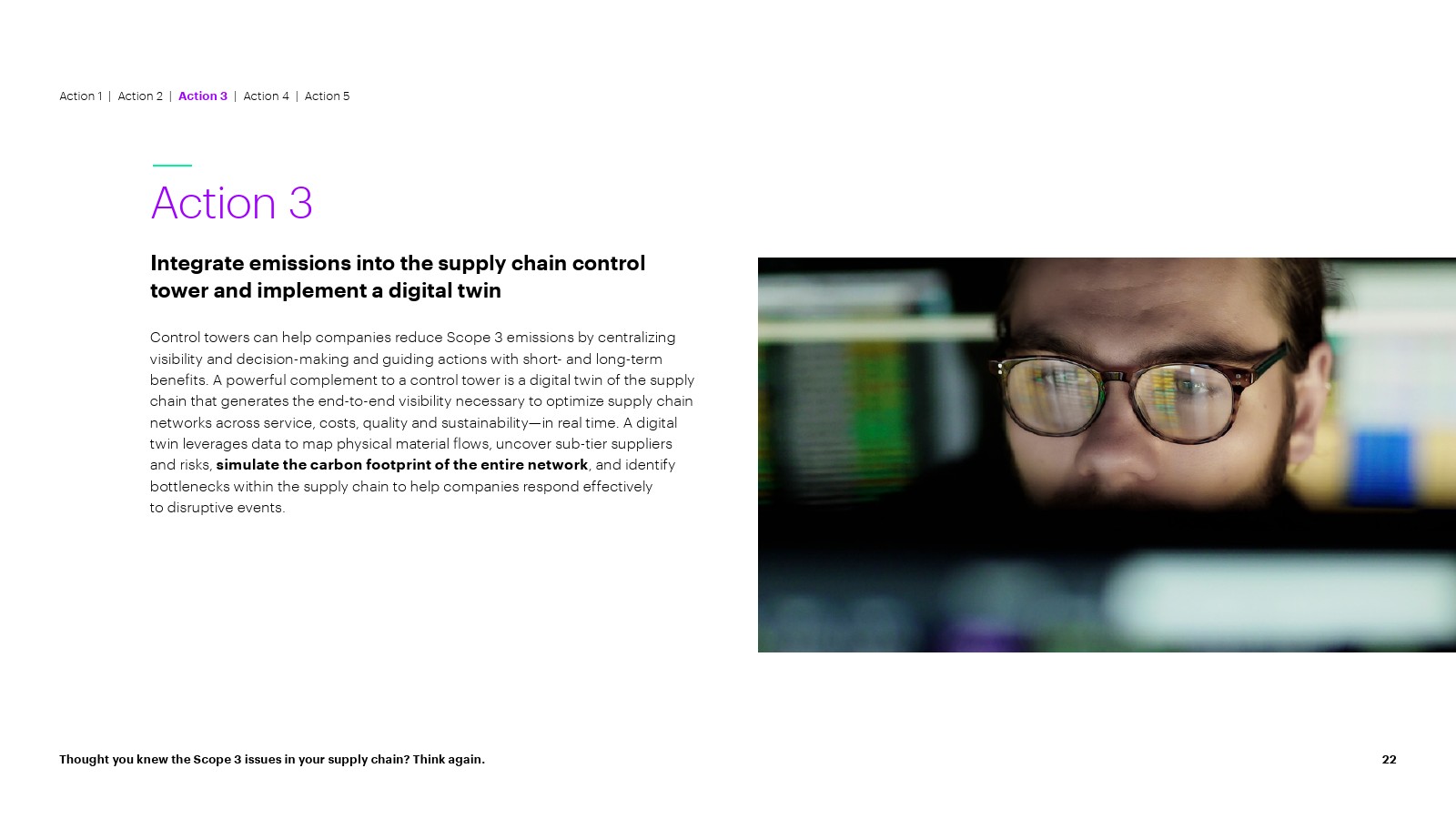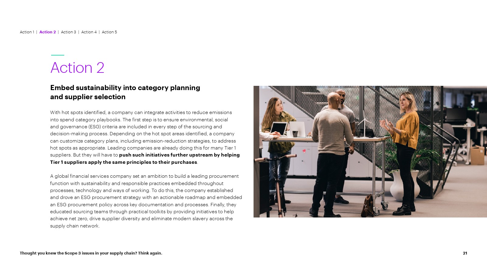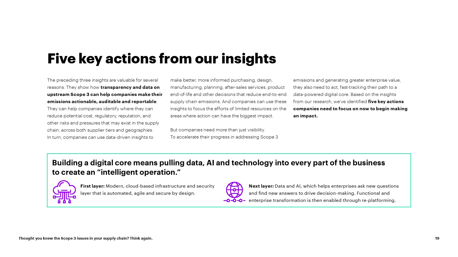随着对核心业务中嵌入的上游范围 3 排放和碳情报的可见性的提高,公司可以就如何以及在何处分配资源做出更明智的决策; 确保整个企业负责任的采购,以推动有意义的减排。通过创建更高效、更有弹性、更具成本效益和以客户为中心的供应链网络,发掘更广泛的企业价值。该报告建议所有公司现在可以采取五项关键行动来实现这一点: