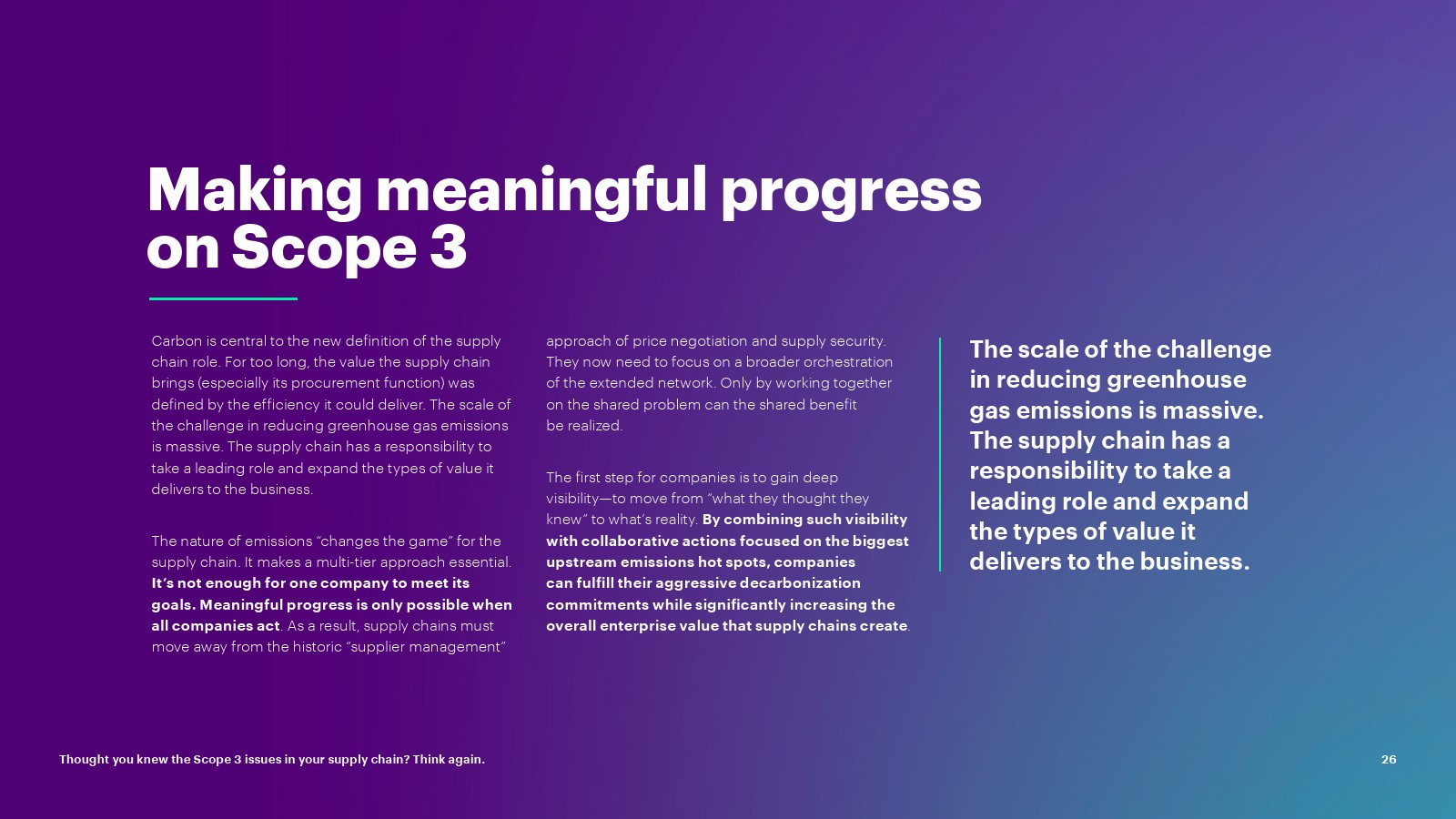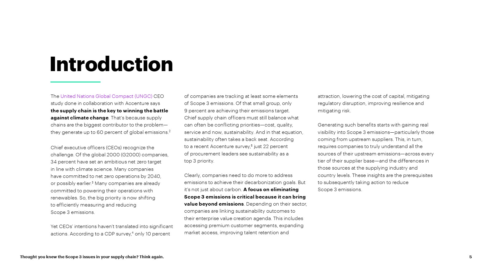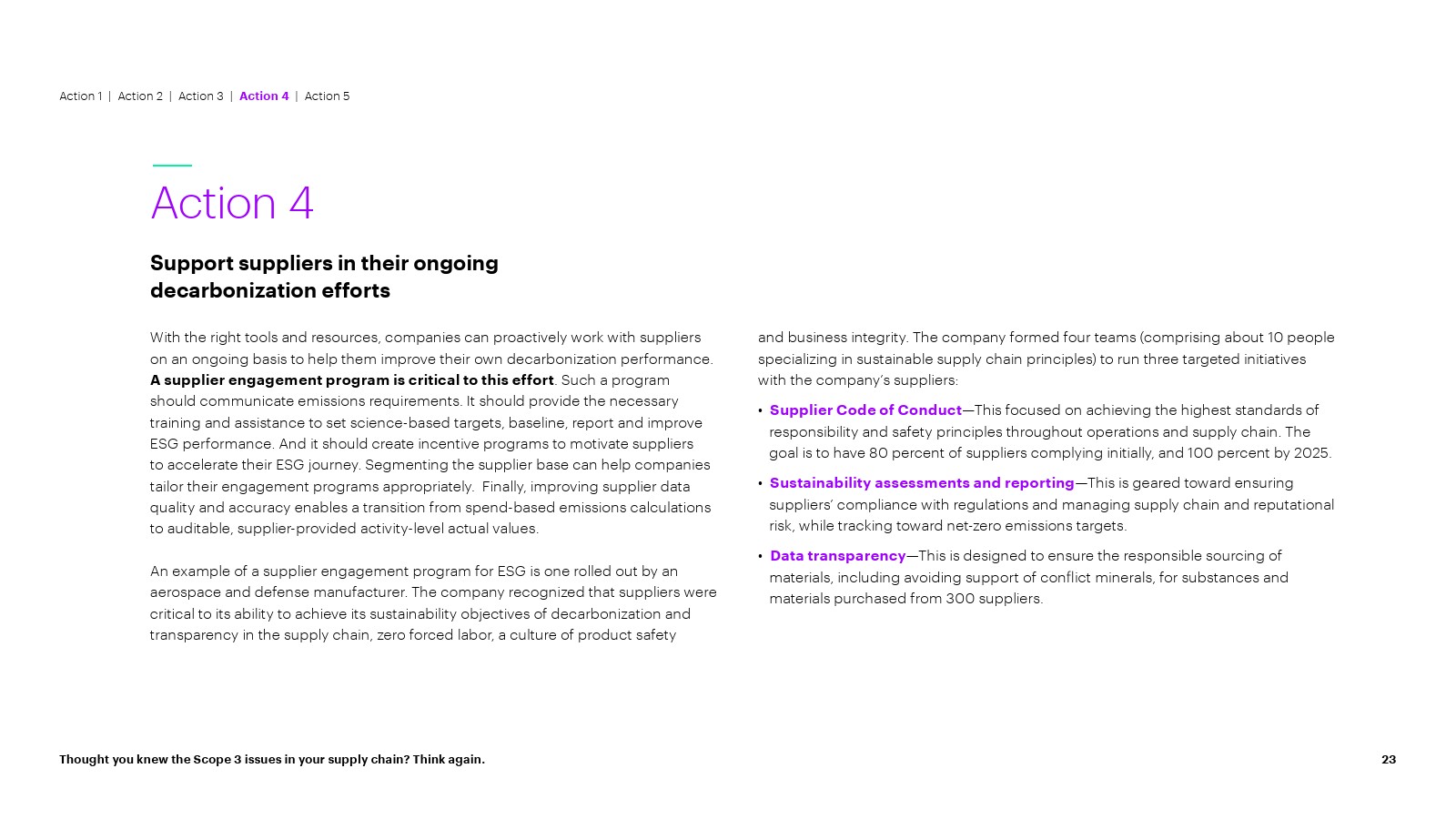 随着对核心业务中嵌入的上游范围 3 排放和碳情报的可见性的提高,公司可以就如何以及在何处分配资源做出更明智的决策; 确保整个企业负责任的采购,以推动有意义的减排。通过创建更高效、更有弹性、更具成本效益和以客户为中心的供应链网络,发掘更广泛的企业价值。该报告建议所有公司现在可以采取五项关键行动来实现这一点: