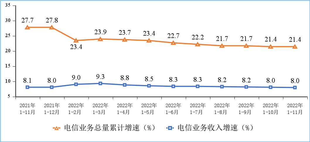 电信业务收入平稳增长,电信业务总量保持高速增长。1—11 月份,电信业务收入累计完成 14504 亿元,同比增长 8%,按照上年不变价计算的电信业务总量同比增长 21.4%,量收增速均与 1—10 月份持平。