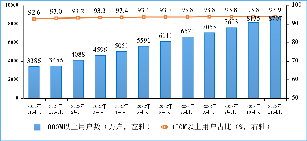 固定宽带接入用户稳步增加,千兆用户规模持续扩大。截至 11 月末,三家基础电信企业的固定互联网宽带接入用户总数达 5.87 亿户,比上年末净增 5117 万户。其中,100Mbps 及以上接入速率的固定互联网宽带接入用户达 5.51 亿户,占总用户数的 93.9%;1000Mbps 及以上接入速率的固定互联网宽带接入用户达 8707 万户,比上年末净增 5248 万户,占总用户数的 14.8%,占比较 1—10 月份提升 0.9 个百分点。