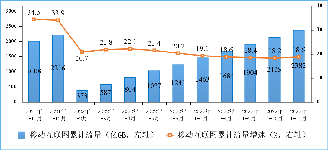 1—11 月份,信息通信行业整体运行平稳。电信业务收入增长稳定,电信业务总量较快增长;5G、千兆光网、物联网等新型基础设施建设加快,网络连接终端用户规模不断扩大;云计算等新兴业务快速增长,行业发展新动能持续增强。