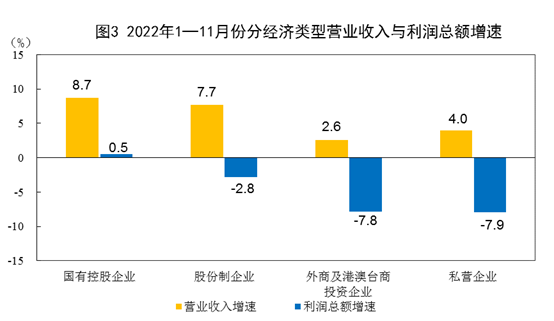 1—11 月份,规模以上工业企业中,国有控股企业实现利润总额 24049.7 亿元,同比增长 0.5%;股份制企业实现利润总额 56412.0 亿元,下降 2.8%;外商及港澳台商投资企业实现利润总额 18378.5 亿元,下降 7.8%;私营企业实现利润总额 22636.9 亿元,下降 7.9%。