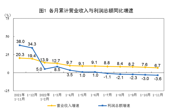 1—11 月份,全国规模以上工业企业实现利润总额 77179.6 亿元,同比下降 3.6%(按可比口径计算,详见阅读原文链接附注二)。
