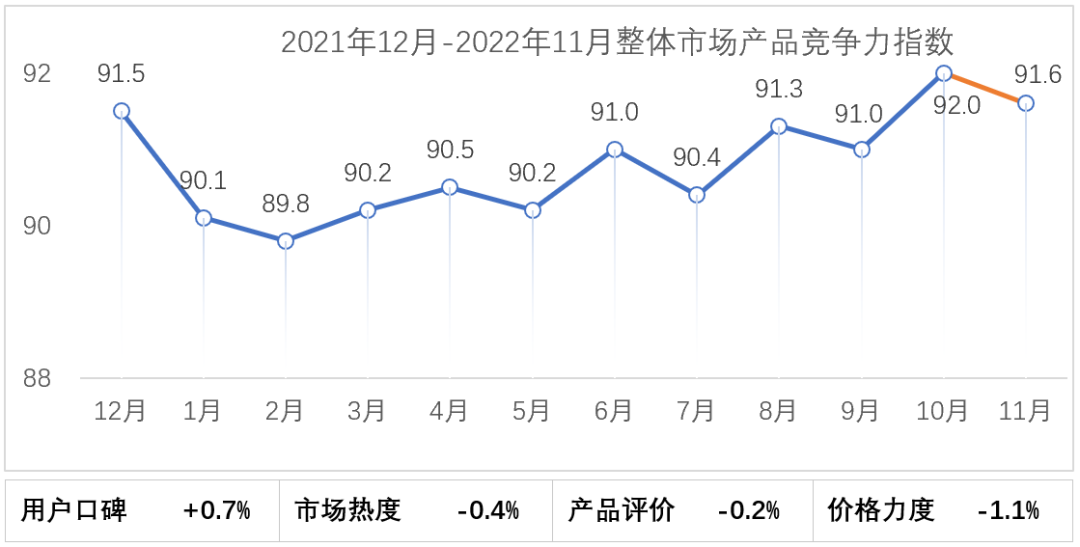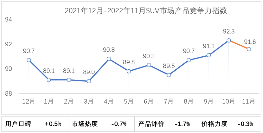 总体来看,2022年11月SUV市场产品竞争力指数为91.6,环比下滑0.7个点,其中产品评价、市场热度和价格力度指标环比分别下滑1.7、0.7和0.3个点,而用户口碑指标环比上升0.5个点。