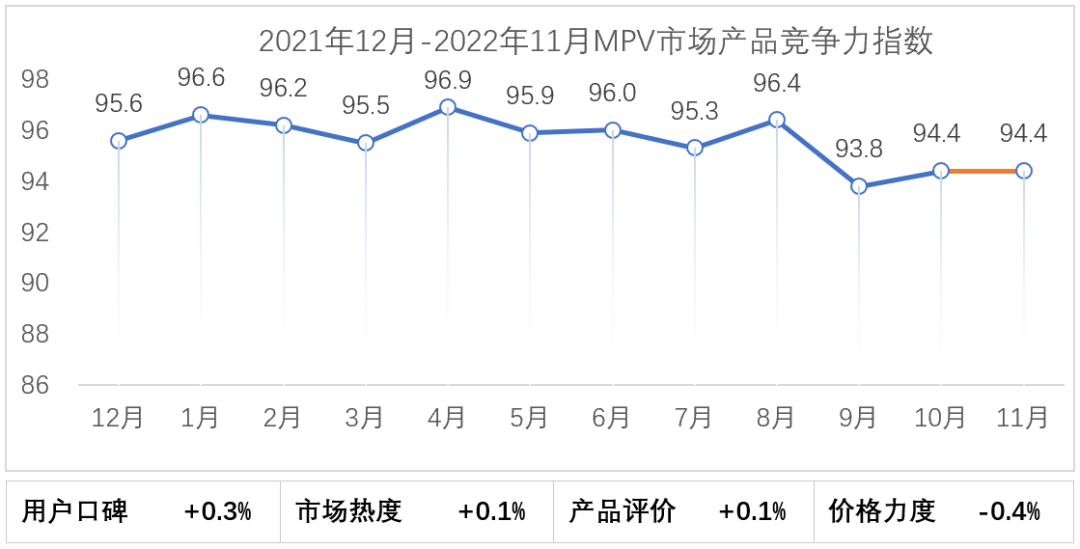 总体来看,2022年11月MPV市场产品竞争力指数为94.4,环比保持不变,其中用户口碑、市场热度和产品评价指标环比分别上升0.3、0.1和0.1个点,而价格力度指标环比下滑0.4个点。